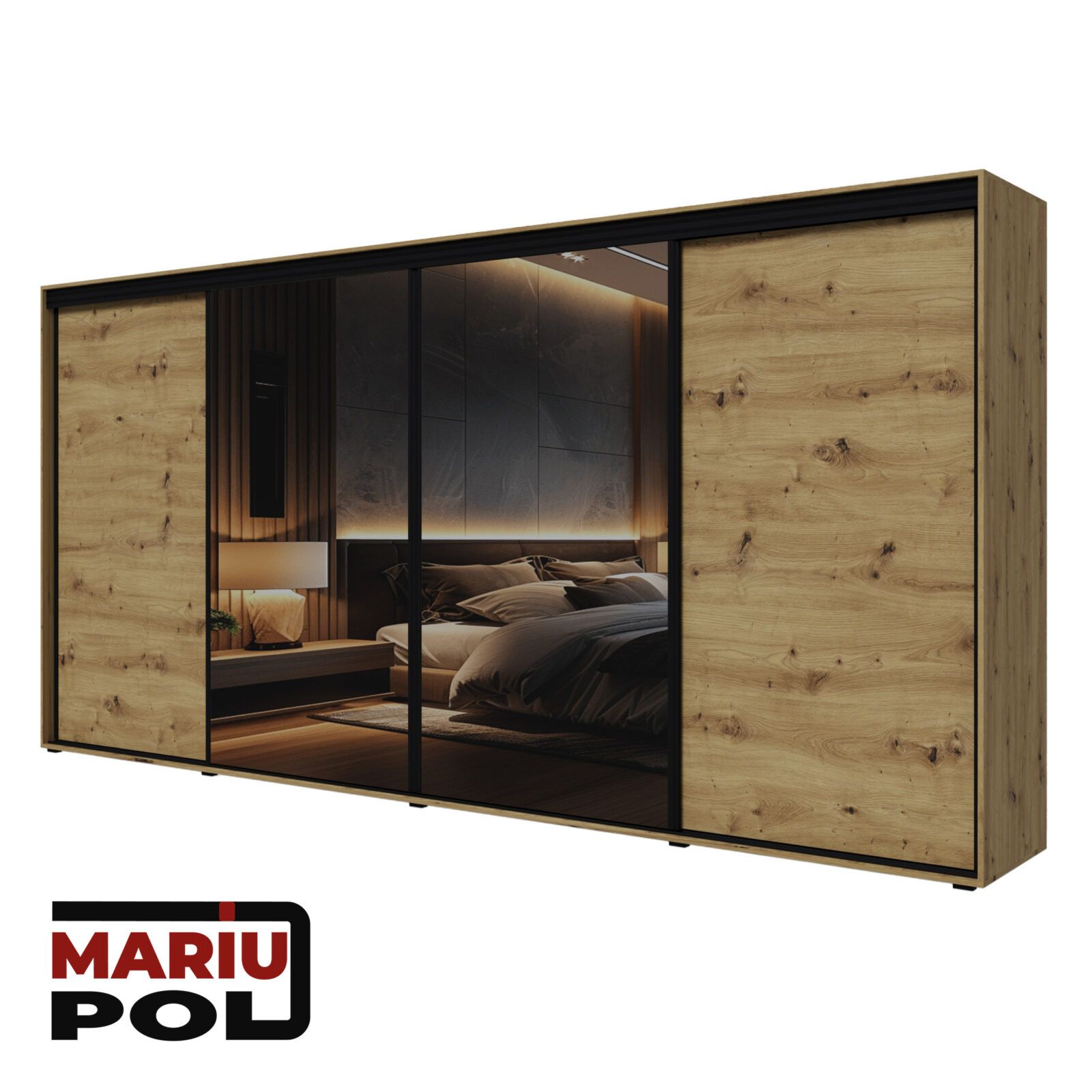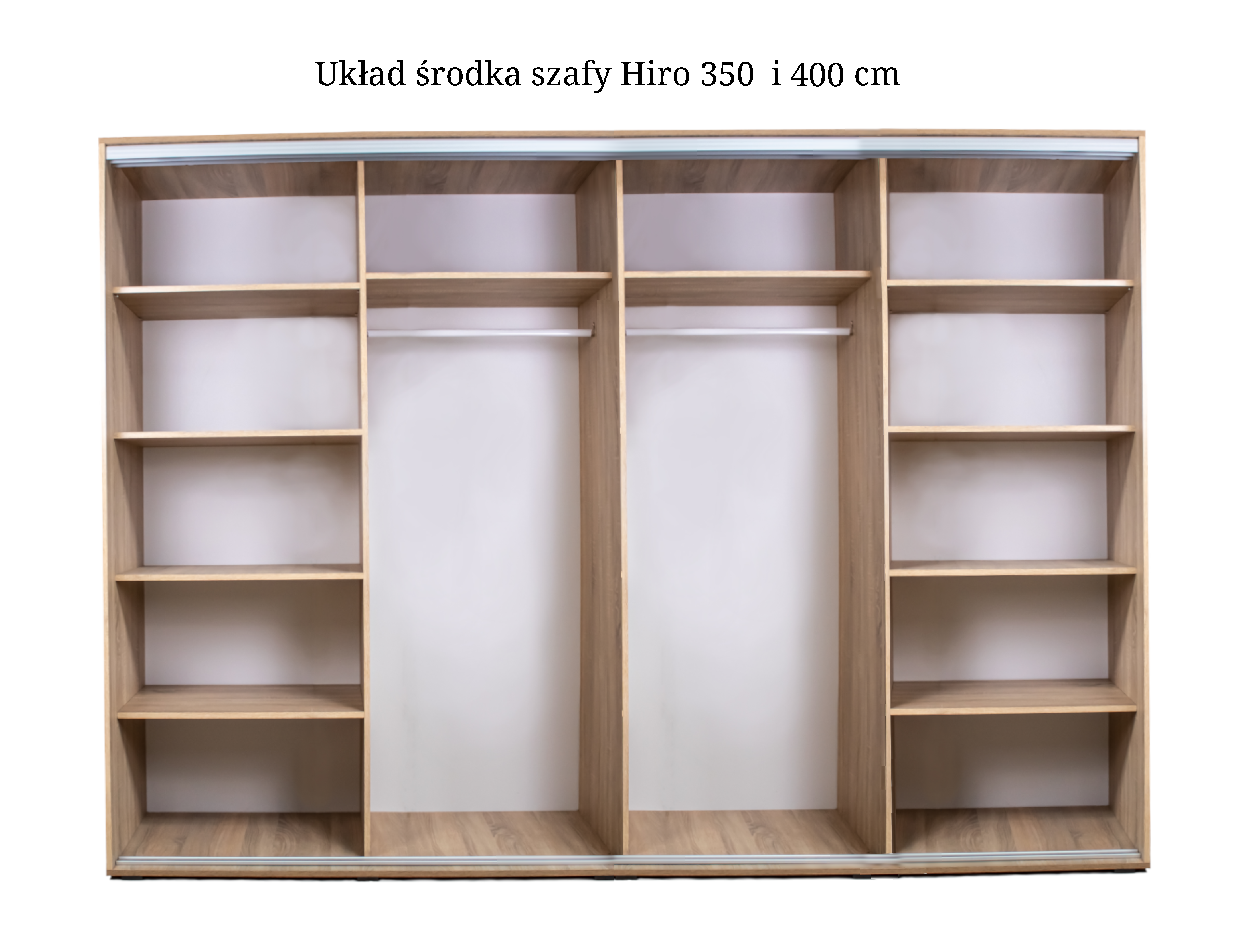 Szafy dostępne w wymiarach szer: 350 cm, 400 cm, wys: 200 cm, gł: 58 cm Możliwość zmiany koloru frontu i korpusu z całej naszej oferty kolorystycznej. W szafach zastosowano prowadnice firmy ” Bimak”
