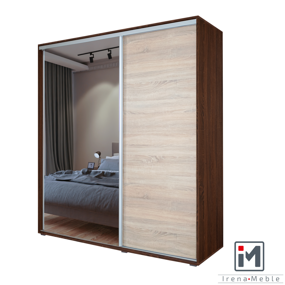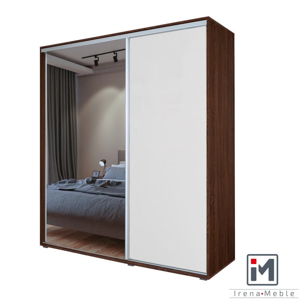 Szafy dostępne w wymiarach szer: 160 cm, 180 cm, 200 cm, wys: 200 cm, gł: 58 cm Możliwość zmiany koloru frontu i korpusu z całej naszej oferty kolorystycznej. W szafach zastosowano prowadnice firmy ” Bimak”